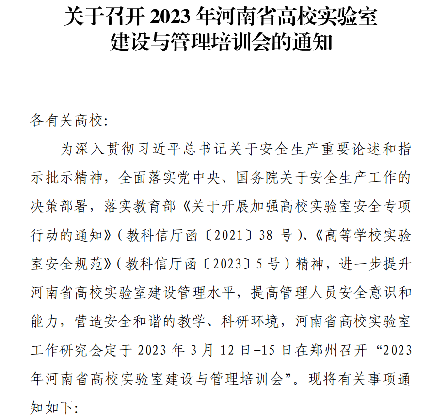 关于召开2023年河南省高校实验室建设与管理培训会的通知